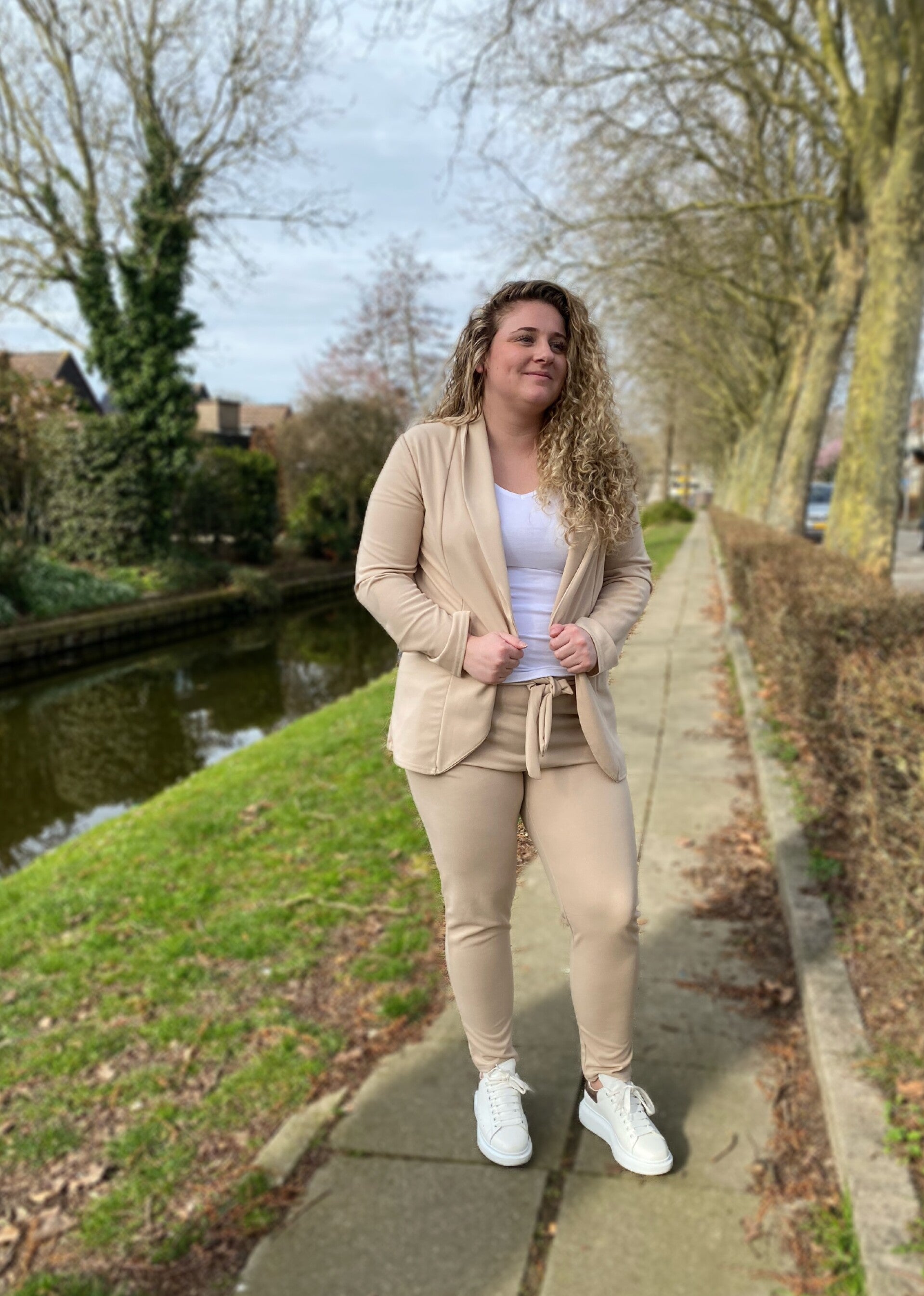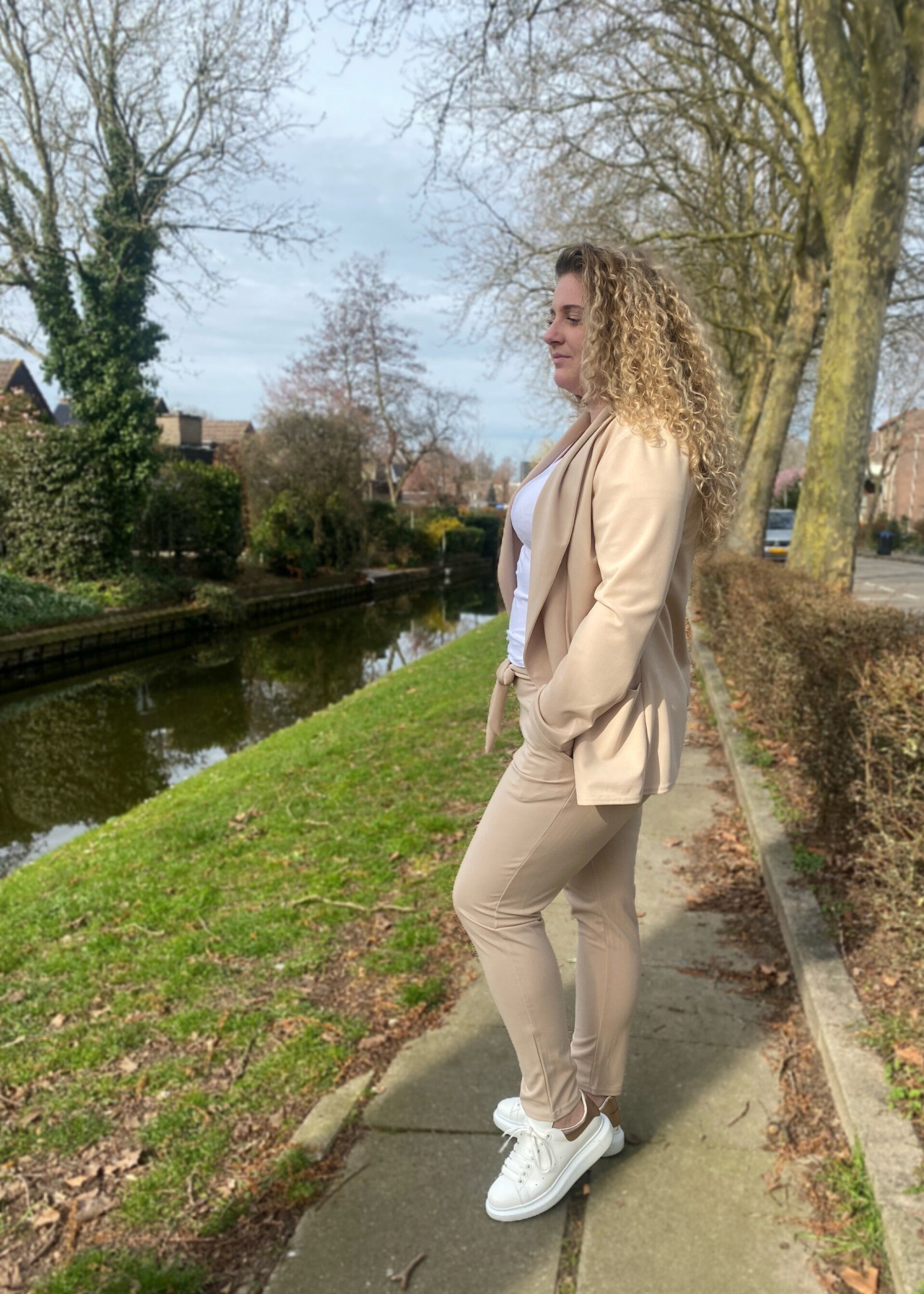 De Blazer en de pantalon hebben aan beide kanten insteekzakken. De achterkant van de pantalon heeft geen zakken.