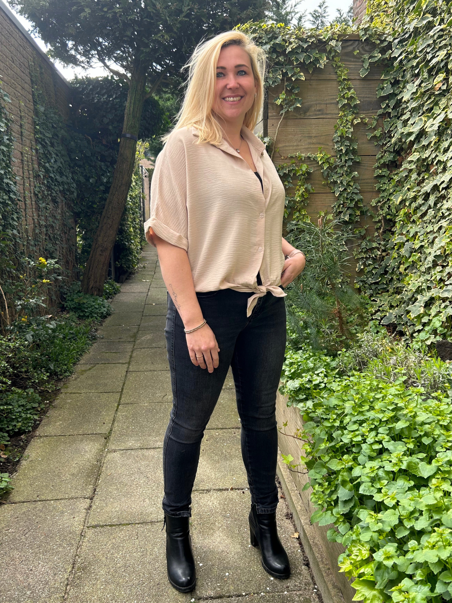 Hoe leuk is deze ruimvallende blouse met korte mouw! Kan aan de onderkant worden geknoopt.