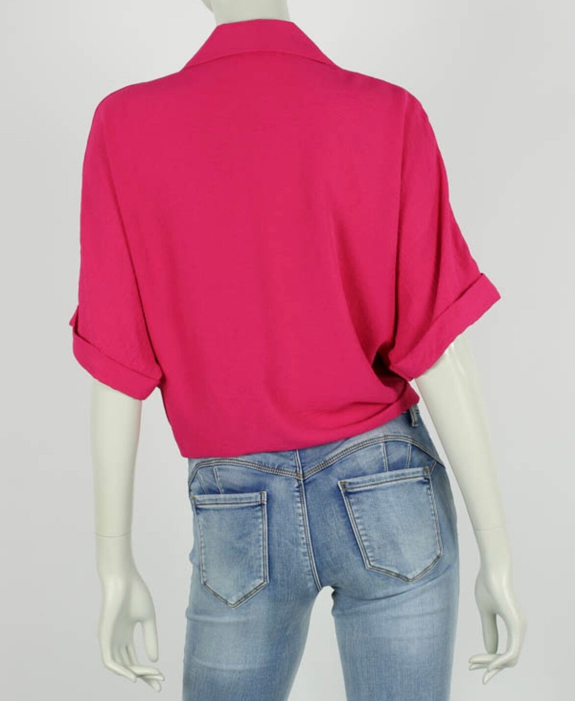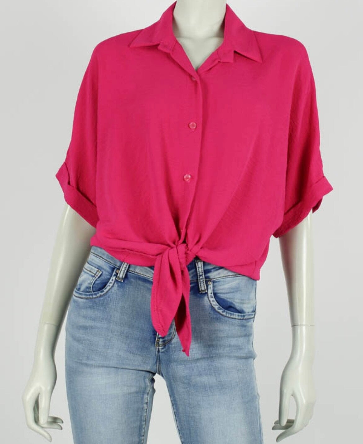 Hoe leuk is deze ruimvallende blouse met korte mouw! Kan aan de onderkant worden geknoopt.