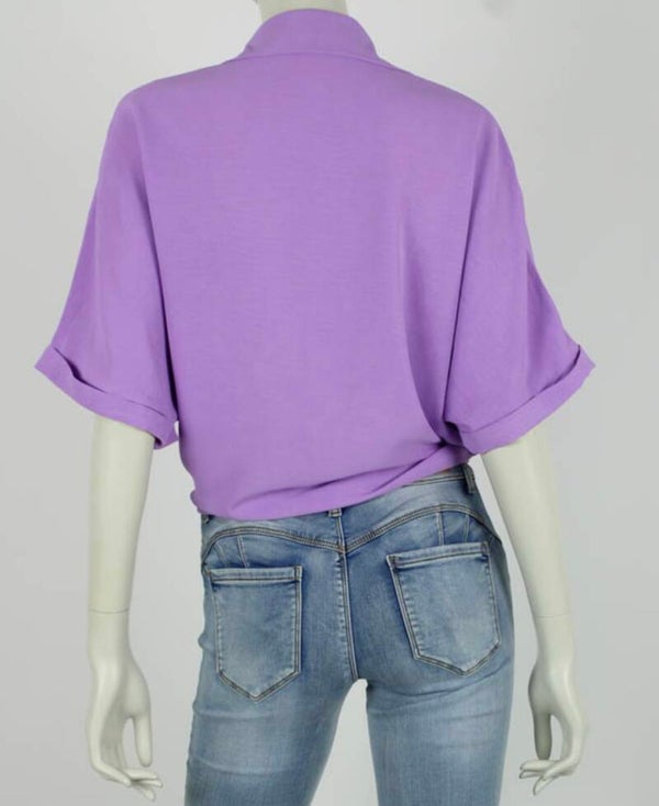 Hoe leuk is deze ruimvallende blouse met korte mouw! Kan aan de onderkant worden geknoopt.