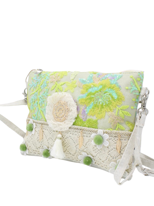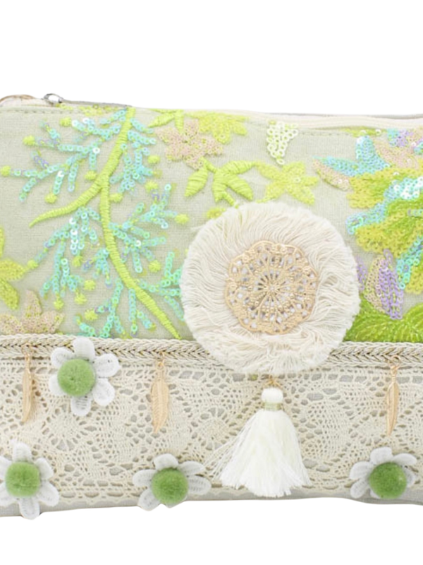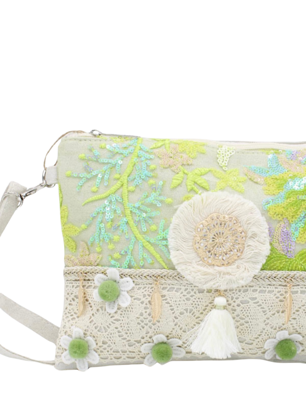 Love deze clutch in beach style! Deze tas heeft pailetten, bloemen en veren met een gouden afwerking en een shiny look all over.