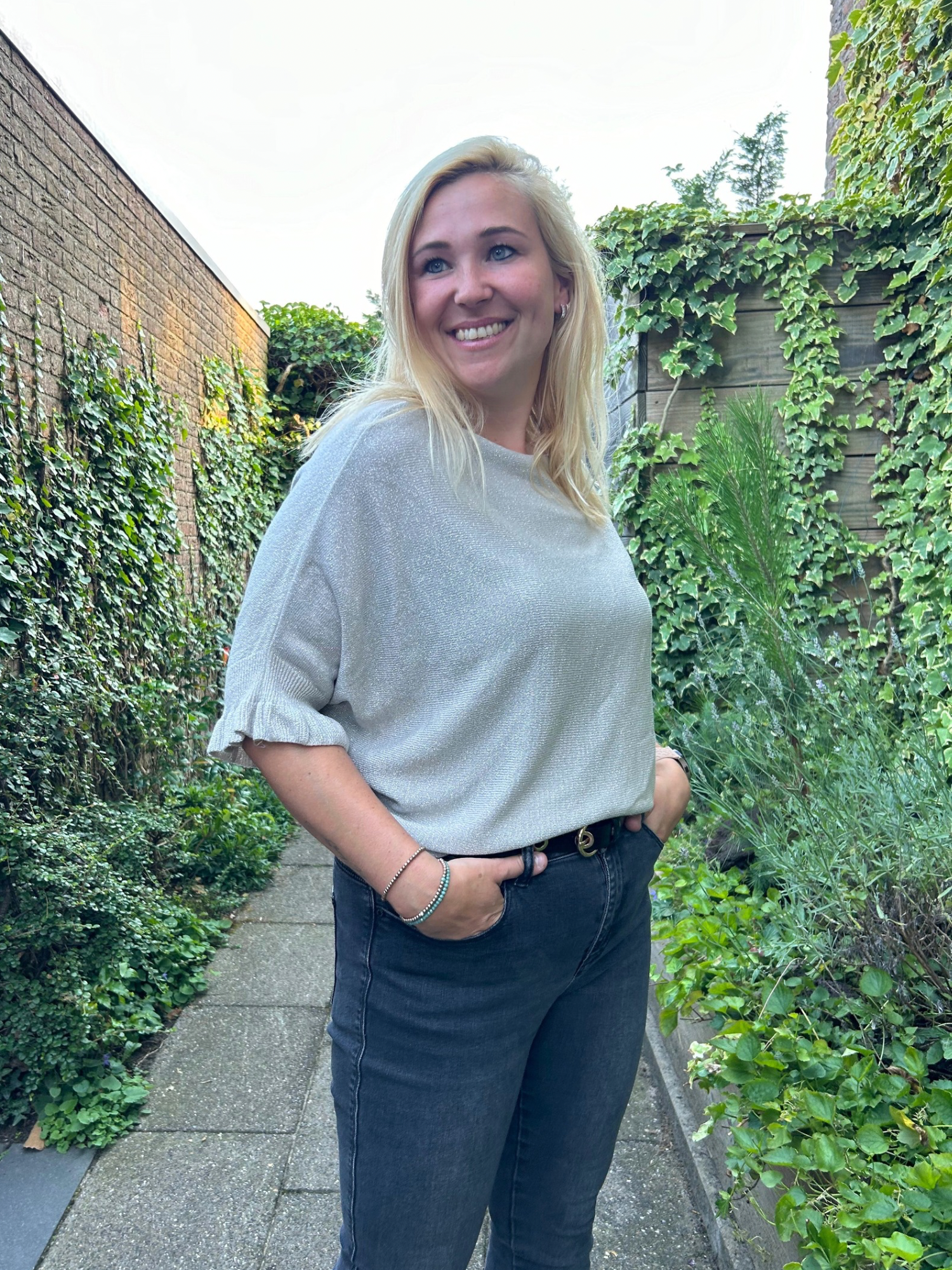 Deze ruimvallende top met fijn gebreide lurex glitterdraad is een echte musthave in je garderobe! Deze top heeft een ¾ mouw met leuke ruche.