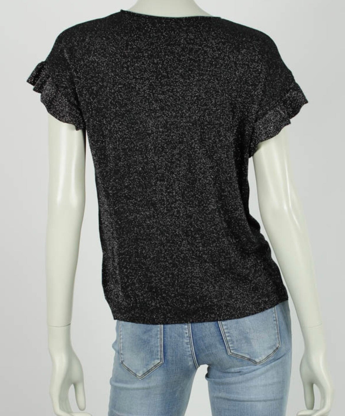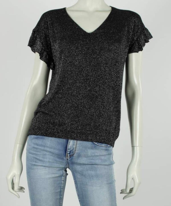 Hoe leuk is deze top Maggy met lurex glitterdraad! Deze top heeft een korte mouw met ruche en een V-hals.