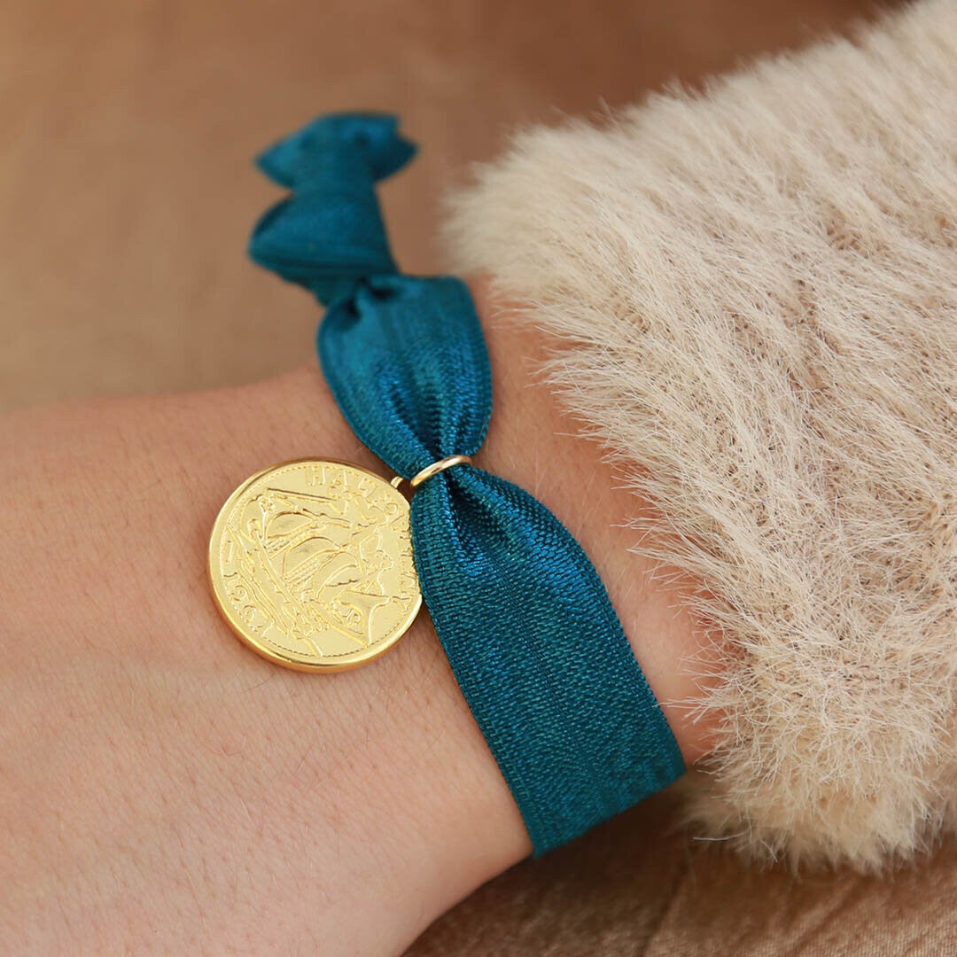 Leuk armbandje van een blauw Ibiza elastiekje en een grote gouden munt bedel.