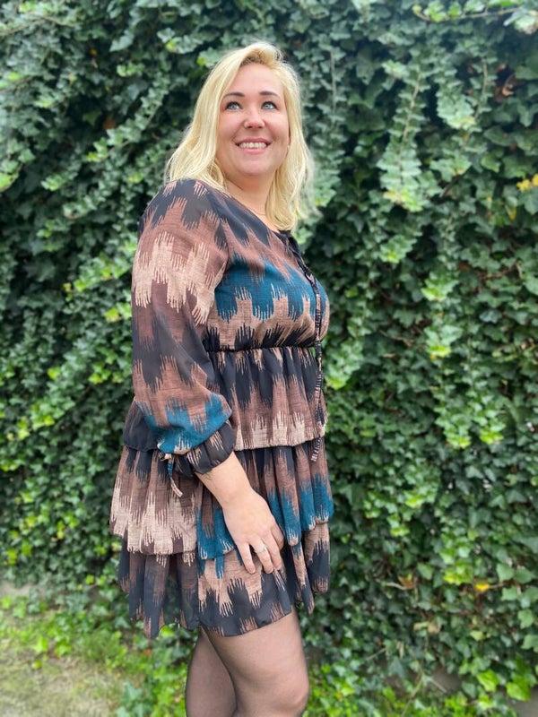 Deze trendy jurk is onmisbaar in jouw garderobe! Hoe leuk is deze print met kobalt blauw gecombineerd met mooie kleuren.