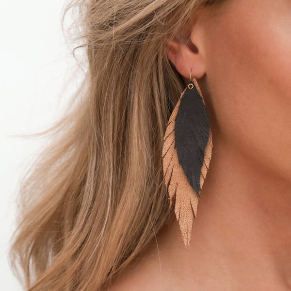 Oorbellen Bohemian feather (echt leer) - Camel/zwart